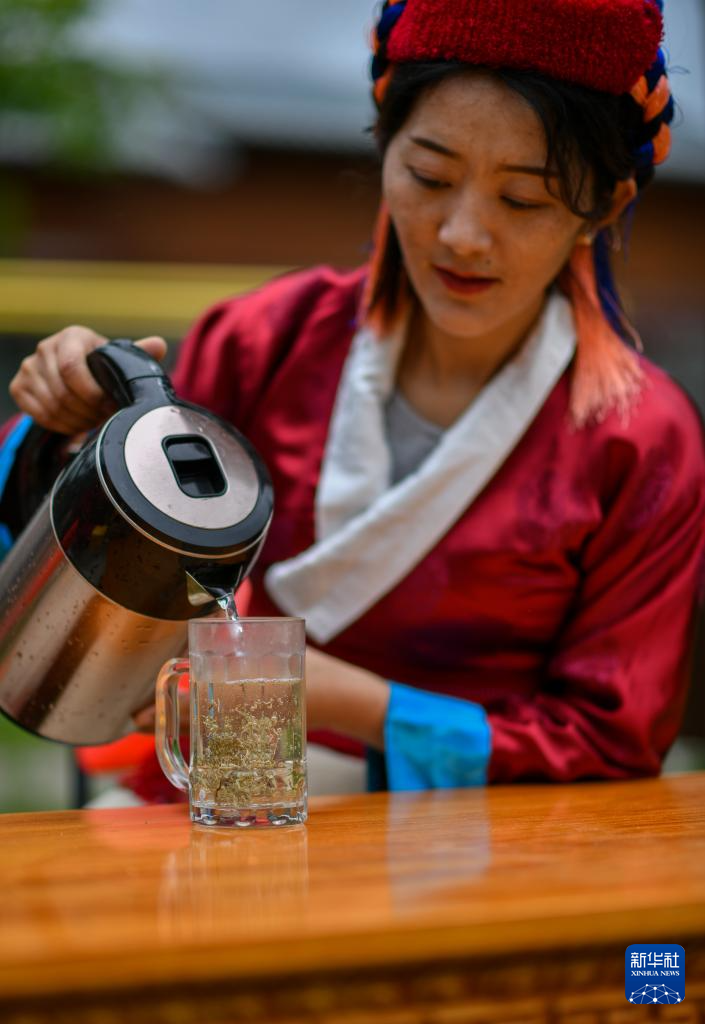 錯(cuò)那市貢日門巴民族鄉(xiāng)斯木村第一書記尼瑪卓瑪在沏泡莓茶(7月28日攝)。新華社記者 姜帆 攝