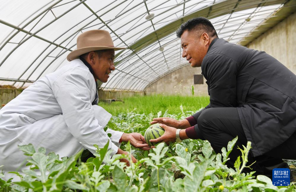 措勤縣農(nóng)牧業(yè)技術(shù)推廣站站長(zhǎng)吾金次仁(右)和措勤縣高原生態(tài)畜牧業(yè)現(xiàn)代化養(yǎng)殖一體化產(chǎn)業(yè)綜合基地合作社負(fù)責(zé)人扎西桑布在西瓜大棚里交流(8月19日攝)。新華社記者 張汝鋒 攝