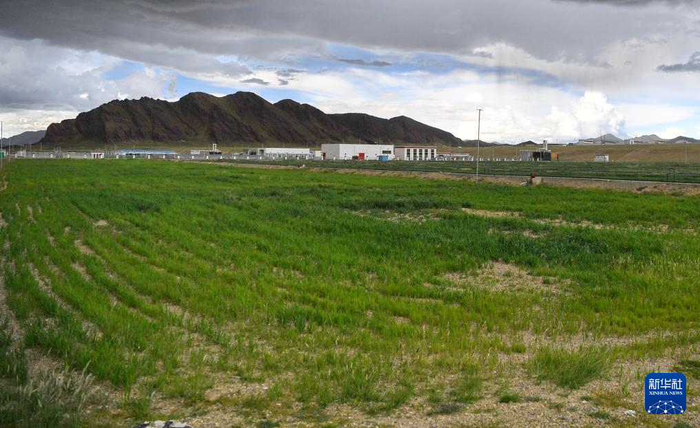 措勤縣高原生態(tài)畜牧業(yè)現(xiàn)代化養(yǎng)殖一體化產(chǎn)業(yè)綜合基地合作社人工草場(chǎng)和遠(yuǎn)處的產(chǎn)業(yè)園區(qū)廠房(8月19日攝)。新華社記者 張汝鋒 攝