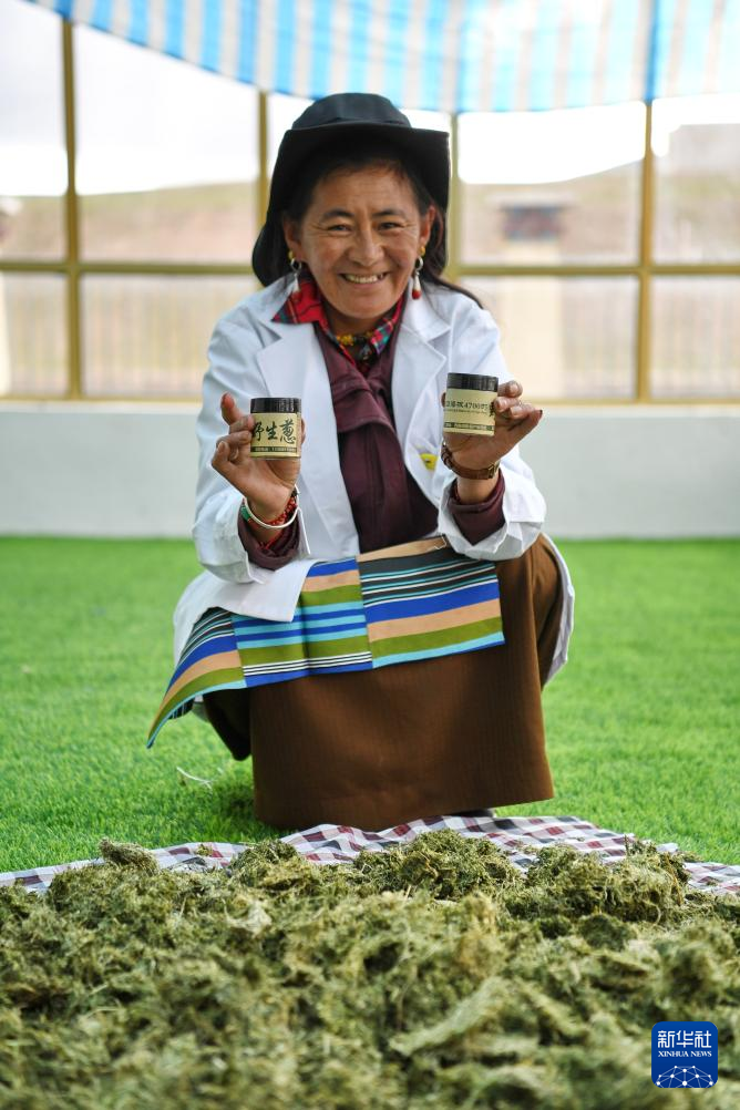 措勤縣高原生態(tài)畜牧業(yè)現(xiàn)代化養(yǎng)殖一體化產(chǎn)業(yè)綜合基地合作社社員展示產(chǎn)業(yè)園區(qū)特產(chǎn)——野蔥調(diào)味品(8月19日攝)。新華社記者 張汝鋒 攝