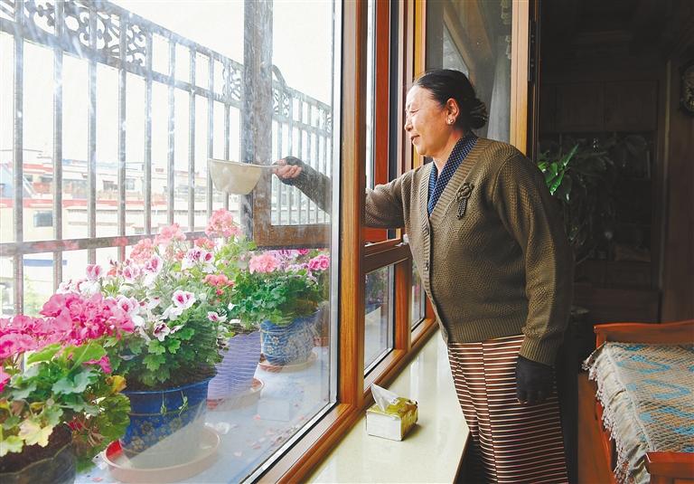 目前,西藏住房保障已覆蓋所有地市、縣(區(qū))和鄉(xiāng)鎮(zhèn),構(gòu)建了以周轉(zhuǎn)房、公共租賃住房(廉租房)為主體,推進(jìn)城鎮(zhèn)棚戶(hù)區(qū)改造和城鎮(zhèn)老舊小區(qū)改造的住房保障體系,通過(guò)實(shí)物配租與租賃補(bǔ)貼并舉方式,基本實(shí)現(xiàn)了城鎮(zhèn)低保和低收入住房困難家庭應(yīng)保盡保。 圖為居住在拉薩市城關(guān)區(qū)加榮棚戶(hù)區(qū)小康安居園的央金,在家里澆花。記者 蔣蓋 攝