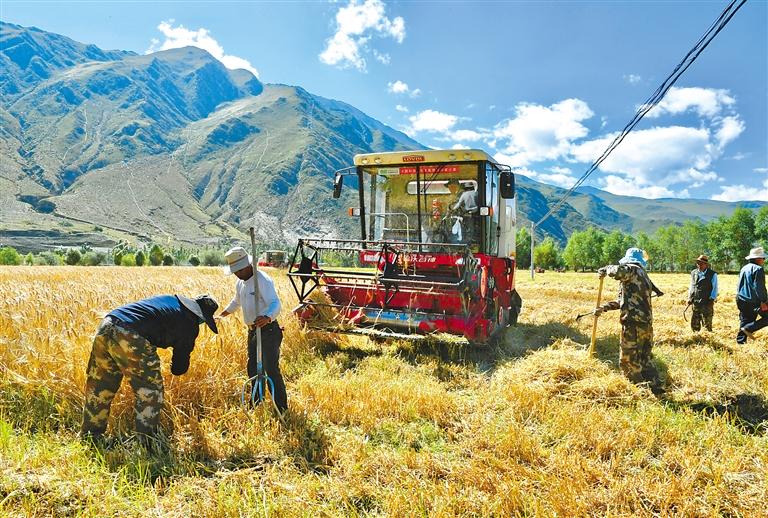 圖為拉薩市達(dá)孜區(qū)塔杰鄉(xiāng)巴嘎雪村村民使用大型機械進(jìn)行收割。記者 旦增蘭澤 攝