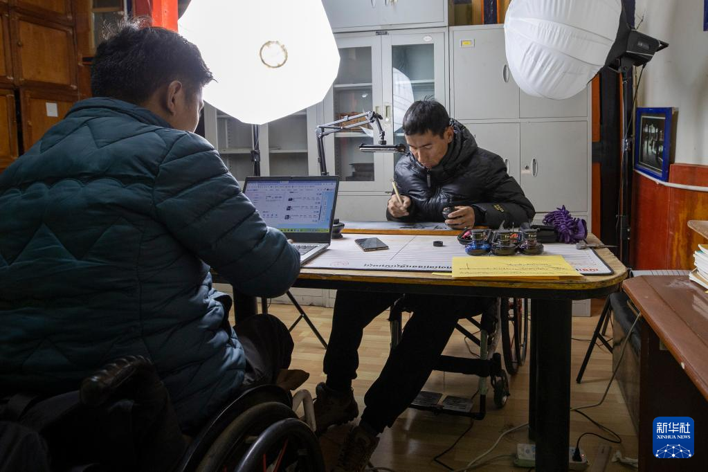 西藏拓崗文化傳播有限公司主播次旦貢嘎(右)與直播助理扎西旺堆在合作直播銷售藏語學習文具(11月10日攝)。新華社記者 姜帆 攝