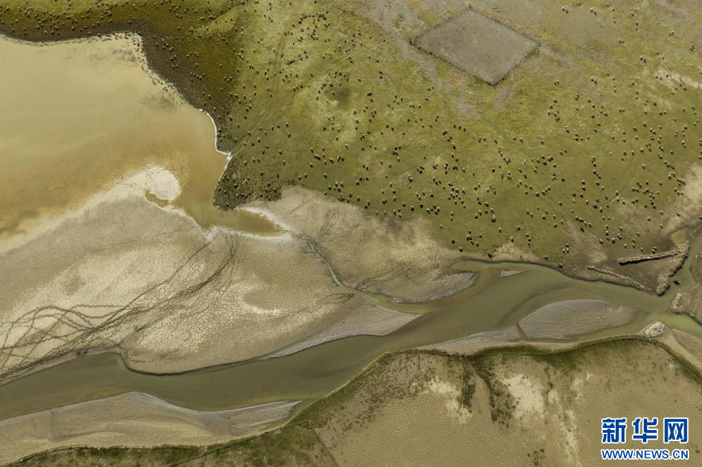 在西藏措美縣境內(nèi)拍攝的羊群(無人機(jī)照片)。新華網(wǎng) 旦增努布 攝