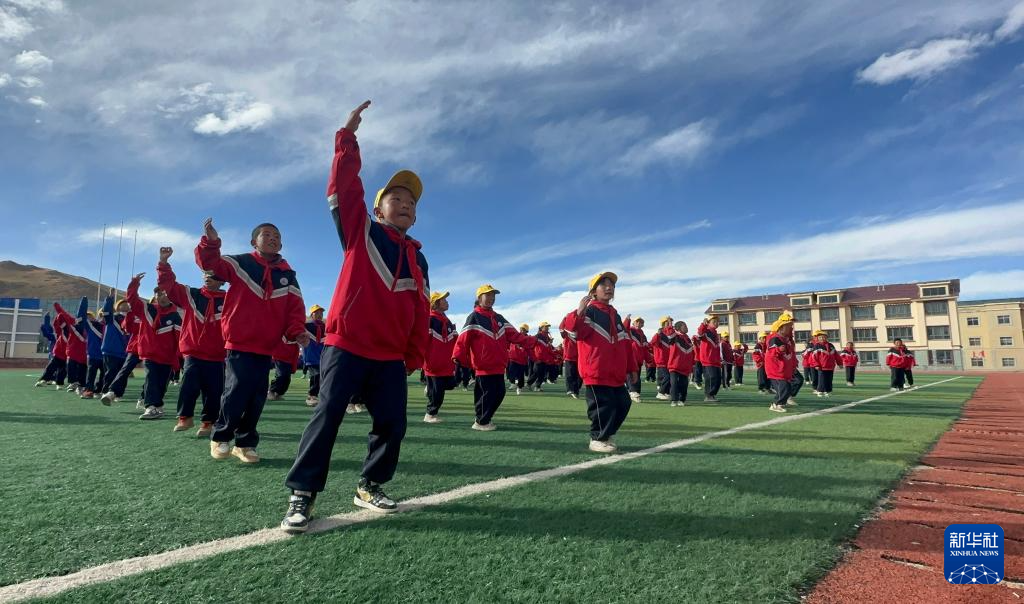10月13日,在西藏那曲市班戈縣中石化小學(xué),學(xué)生在操場(chǎng)上跳“班戈諧欽”課間操。新華社發(fā)(孔琳琳 攝)