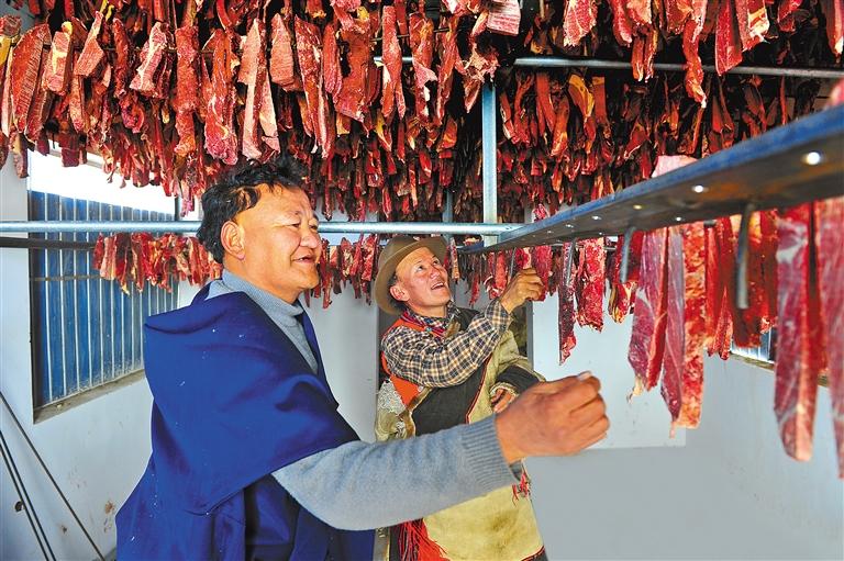 上左左農(nóng)牧民合作社經(jīng)理桑嘎石確(左)和村委會主任羅布占堆在查看晾制的風(fēng)干牦牛肉。記者 溫凱 攝