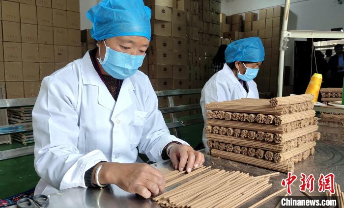 “我們農(nóng)閑時就會來這里制作藏香?!睅孜宦耦^工作的婦女不善言談,但她們數(shù)線香、捆藏香流程十分嫻熟,她們足不出村實現(xiàn)就業(yè)增收?! ?/p>