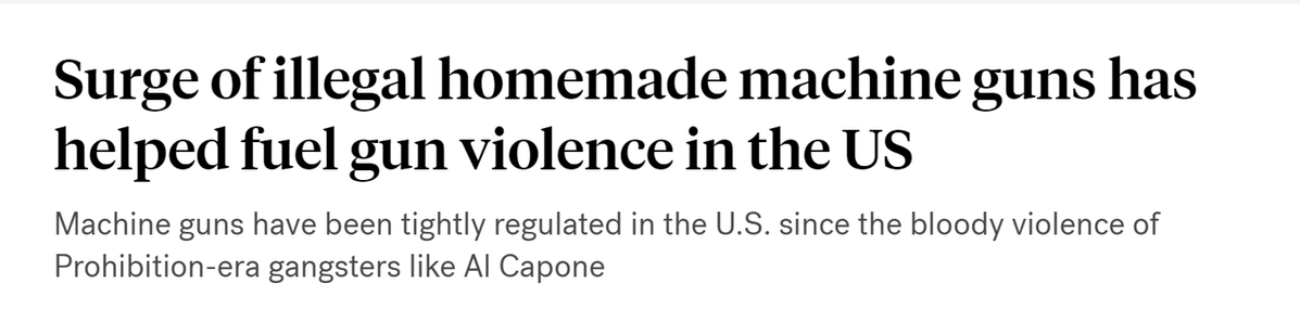 據(jù)報(bào)道,由于3D打印制作或在線購(gòu)買的小型金屬或塑料零件的驚人增長(zhǎng),全美各地近年來(lái)都出現(xiàn)了使用經(jīng)改裝的全自動(dòng)槍支制造的槍擊事件。盡管針對(duì)機(jī)槍的禁令可以追溯到上世紀(jì)二三十年代的禁酒令時(shí)期,但有關(guān)部門表示,格洛克開(kāi)關(guān)、連發(fā)阻鐵等改裝零件的大量增加,使得普通人能夠?qū)⒑戏ǖ陌胱詣?dòng)槍支改裝得更加危險(xiǎn),進(jìn)而助長(zhǎng)了槍支暴力。