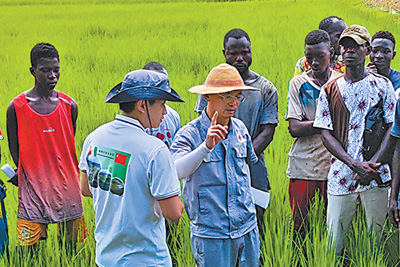中國農(nóng)業(yè)專家為科特迪瓦農(nóng)民進行水稻病蟲防治的培訓(xùn)。