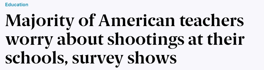 美國獨立新聞媒體The 19th 網(wǎng)站11日報道稱,根據(jù)皮尤研究中心一項新的調(diào)查,絕大多數(shù)美國K-12公立學(xué)校的教師在一定程度上擔(dān)心學(xué)??赡軙l(fā)生槍擊事件。并且,多數(shù)教育工作者贊成對學(xué)生們進行更多心理健康篩查和治療并反對教職工配槍上班。