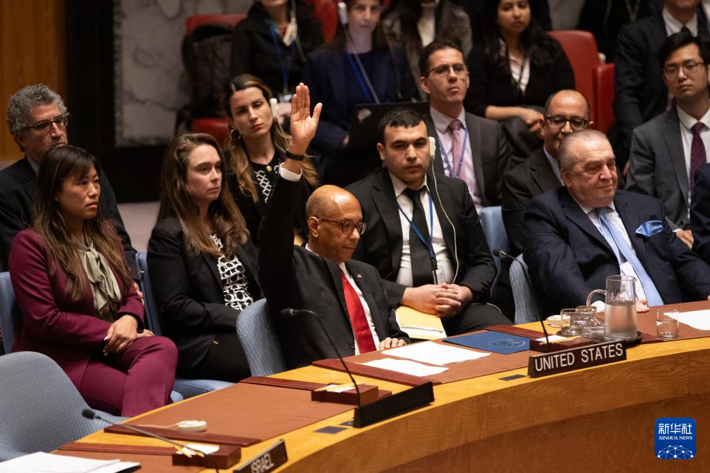 4月18日,在位于紐約的聯(lián)合國總部,美國常駐聯(lián)合國副代表羅伯特·伍德(前左)在安理會就決議草案進行表決時投反對票。新華社記者 謝鍔 攝