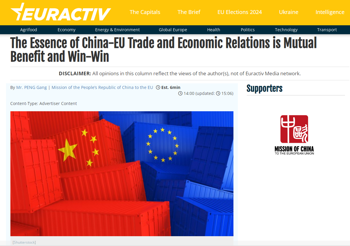 對此,中國駐歐盟使團(tuán)負(fù)責(zé)經(jīng)貿(mào)事務(wù)的公使彭剛在歐洲知名媒體“歐盟動態(tài)”發(fā)表題為《中歐經(jīng)貿(mào)關(guān)系的本質(zhì)是互利共贏》的署名文章。文章強(qiáng)調(diào),“去風(fēng)險”不應(yīng)成為“去機(jī)遇”。中國始終認(rèn)為中歐經(jīng)濟(jì)具有高度互補(bǔ)性,中國超大規(guī)模市場和歐洲4.5億人口的統(tǒng)一大市場,是彼此經(jīng)濟(jì)發(fā)展的巨大機(jī)遇。當(dāng)前,“去風(fēng)險”成為歐盟對華經(jīng)貿(mào)政策的重點(diǎn)。我們理解各方都有自己的關(guān)切,重要的是如何合理地界定和防范風(fēng)險。中方反對將經(jīng)濟(jì)問題政治化、意識形態(tài)化、泛安全化,使“去風(fēng)險”變成“去機(jī)遇”和“去合作”。