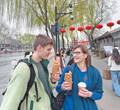 4月初,利用免簽政策赴華旅游的比利時(shí)游客在北京后海品嘗小吃。梵尚·沃姆攝