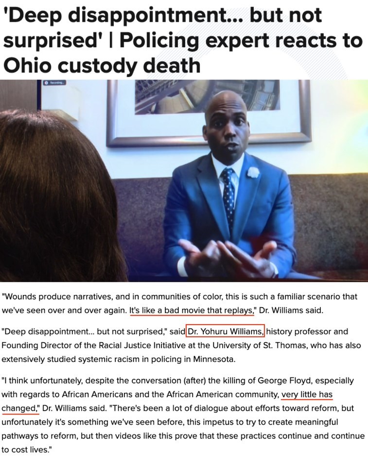 長期從事種族研究的美國圣托馬斯大學歷史學教授、該校種族正義計劃發(fā)起人約胡魯·威廉姆斯在接受采訪時表示,他對泰森遇害深感失望,但并不驚訝。