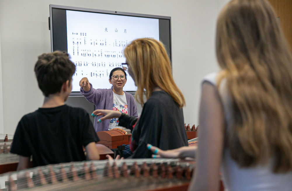 2024年4月29日,在貝爾格萊德中國(guó)文化中心,古箏指導(dǎo)老師王宣(后)在教學(xué)。