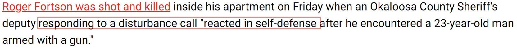 佛羅里達(dá)州奧卡魯沙縣警察局在事后發(fā)表的聲明中稱,涉事警察在案發(fā)當(dāng)天接到有關(guān)“擾亂公共秩序”的報警,后來在看到福特森持槍時出于“自衛(wèi)”才開火。