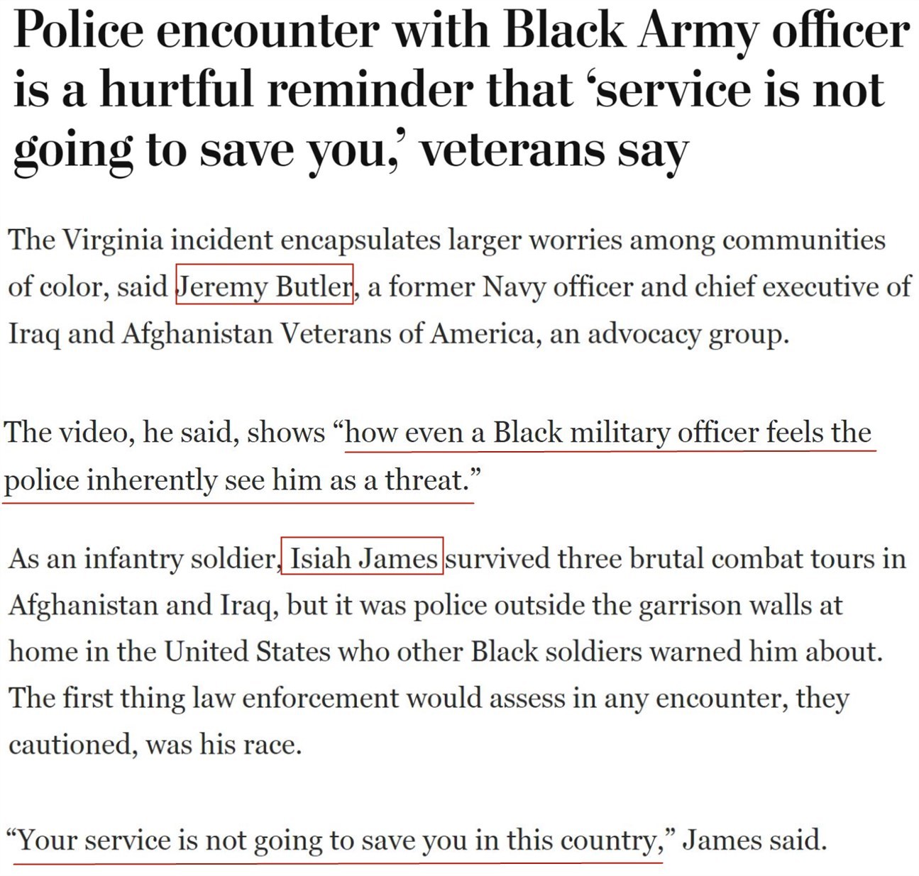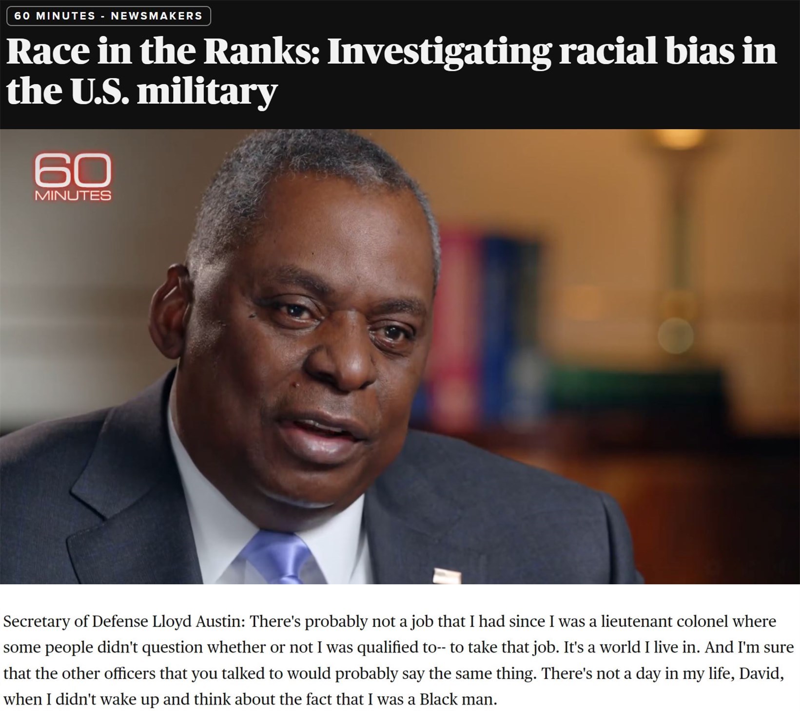 “(非裔)在晉升方面的處境仍無改觀,總是有人會因為你的樣貌而對你的任職資格提出疑問,這就是我生活的世界,而且我非??隙▌e的(非裔)軍官也會說同樣的話。在我生命中的每一天,早晨醒來都會思考這個事實:我是一個非洲裔。”