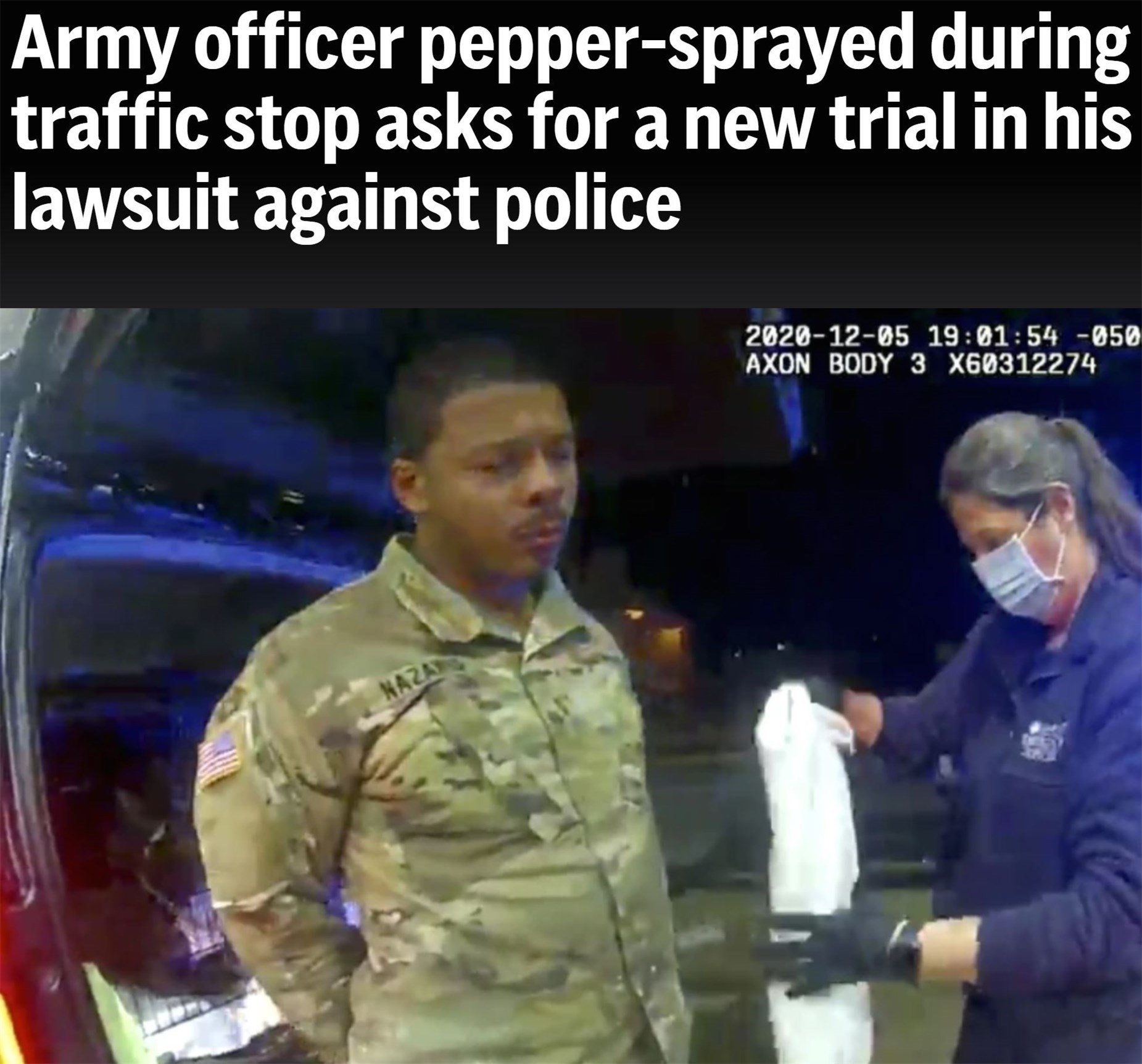 2020年12月,非洲和拉丁裔混血的美國陸軍少尉卡倫·納扎里奧在弗吉尼亞州溫莎市駕駛新買的汽車回家途中,遭遇兩名警察歧視性執(zhí)法。后者不僅以“無照駕車”為由用槍威逼納扎里奧下車,還對他進(jìn)行毆打并使用胡椒噴霧。