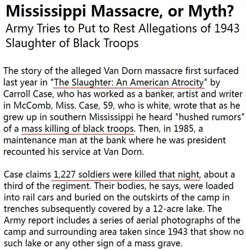 2000年美國曾出版《屠殺:美國的殘暴》一書,首次披露了二戰(zhàn)期間美國白人軍官下令在密西西比州一個陸軍營地血腥屠殺1200多名非裔士兵的歷史黑幕,引起軒然大波。