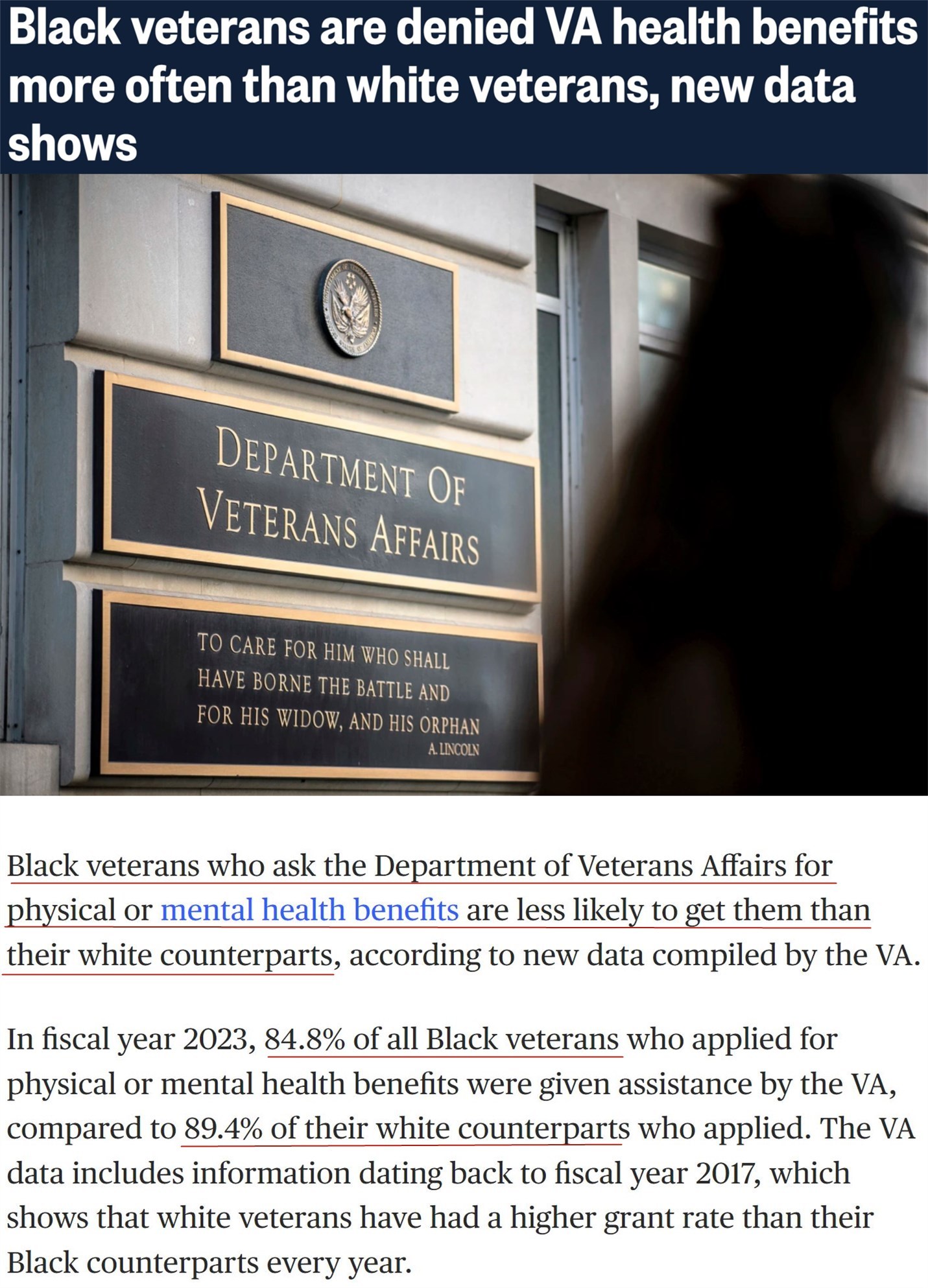△美國全國廣播公司網(wǎng)站:在2023財年,申請身心健康福利的所有非裔退役軍人中有84.8%獲得了退役軍人事務(wù)部的援助,而白人退役軍人的這一比例為89.4%。