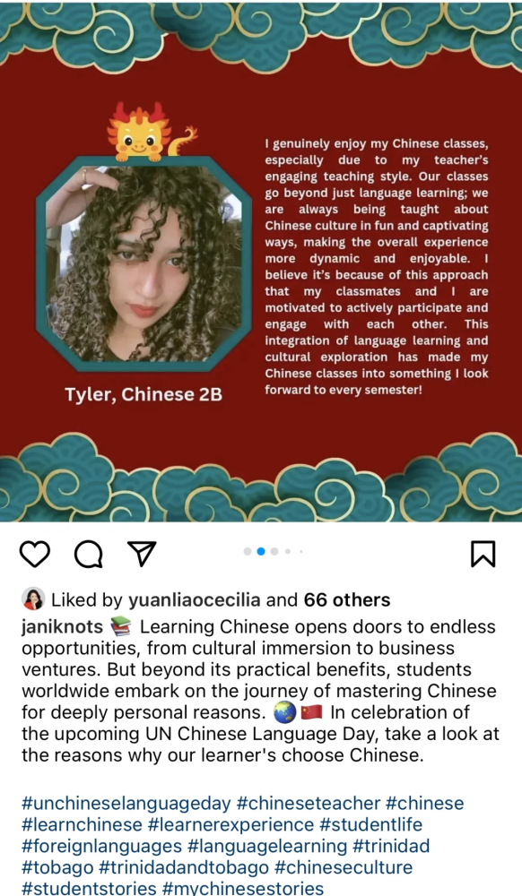 第十五個(gè)聯(lián)合國(guó)中文日和第五個(gè)“國(guó)際中文日”舉辦期間,中外語(yǔ)言交流合作中心與中國(guó)日?qǐng)?bào)網(wǎng)聯(lián)合發(fā)起 “國(guó)際中文日”系列線(xiàn)上活動(dòng),鼓勵(lì)大家講述、分享與中文相遇的精彩故事,半個(gè)月內(nèi)活動(dòng)參與者覆蓋全球五大洲近70個(gè)國(guó)家和地區(qū),包括英國(guó)、意大利、澳大利亞、美國(guó)、巴西、日本、韓國(guó)、泰國(guó)、老撾、迪拜、喀麥隆等,作品超2000件,閱讀量超1000萬(wàn),在中國(guó)和其他國(guó)家主流社交媒體平臺(tái)掀起“中文日”熱潮,吸引了海內(nèi)外網(wǎng)友的廣泛關(guān)注。