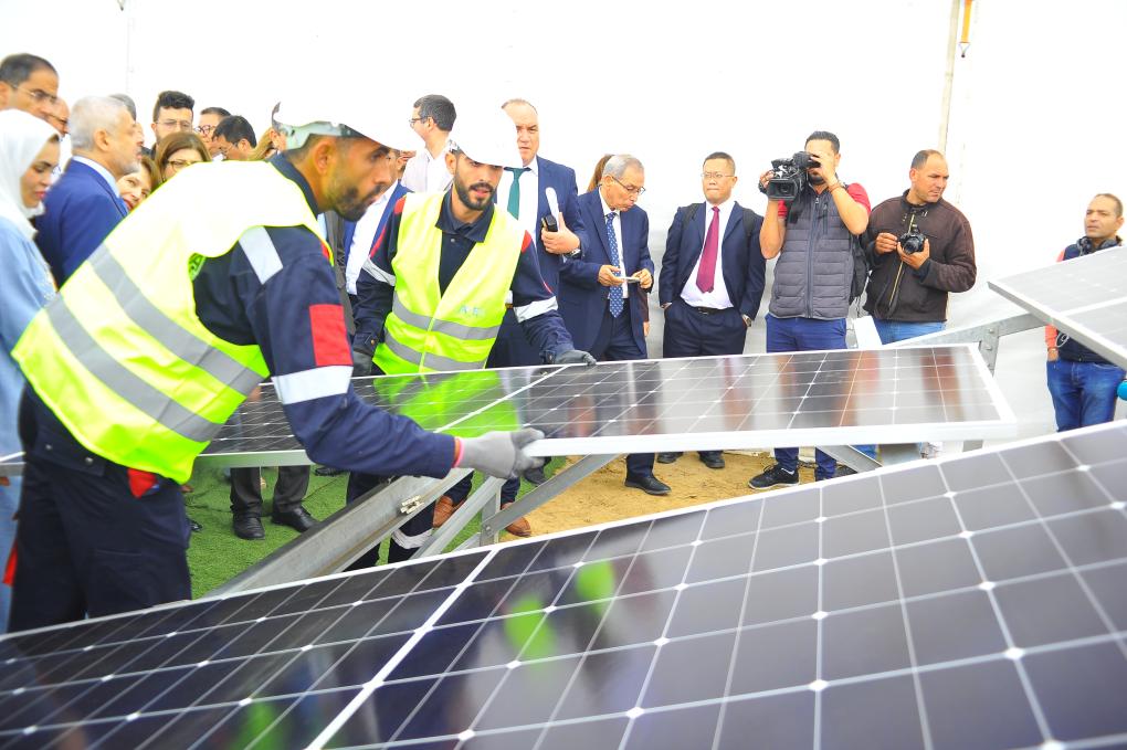 2024年5月8日,在突尼斯凱魯萬(wàn)省,兩名工人演示安裝太陽(yáng)能光伏板。新華社發(fā)(阿代爾攝)