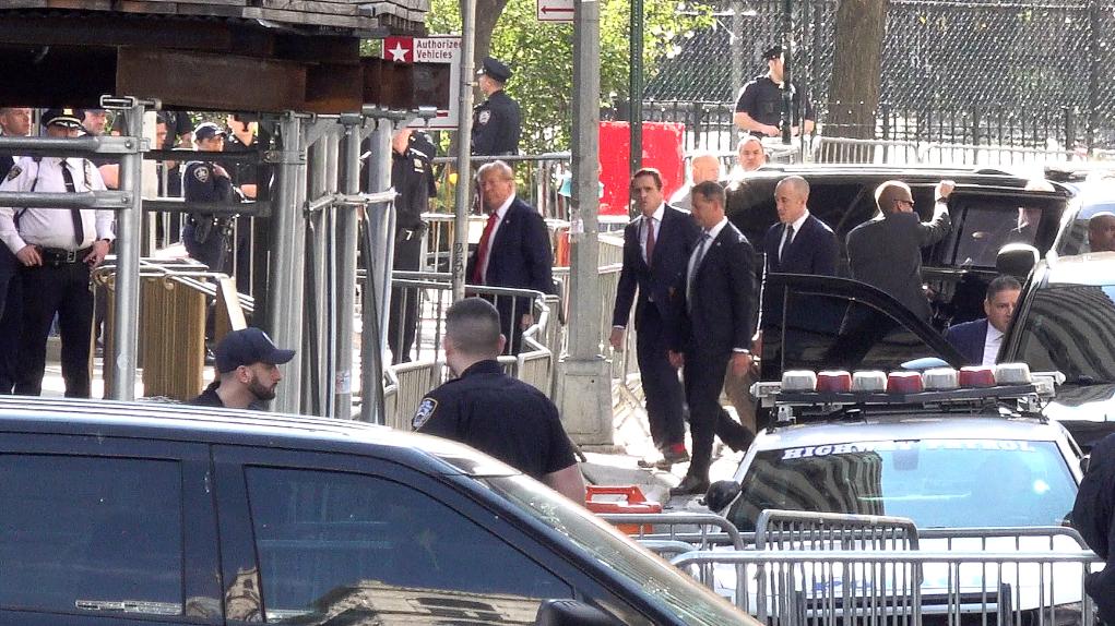 這張4月15日的視頻截圖顯示,美國(guó)前總統(tǒng)特朗普抵達(dá)紐約曼哈頓一家刑事法院出庭。新華社記者 丁曄 攝