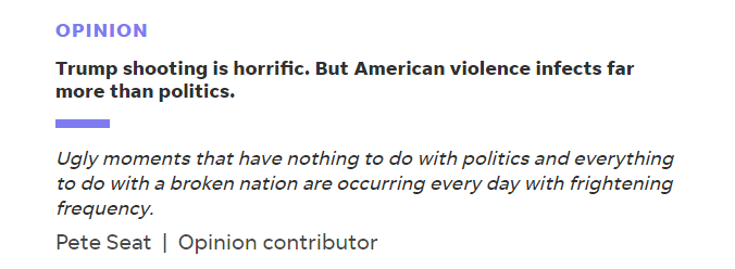 美國(guó)前白宮發(fā)言人、政治評(píng)論員皮特·西特(Pete Seat)日前在《今日美國(guó)報(bào)》(USA Today)網(wǎng)站刊文稱,特朗普在賓夕法尼亞州競(jìng)選集會(huì)上遭“未遂刺殺”之后,盡管美國(guó)的政界人士、評(píng)論家還有普通民眾都在說(shuō)這起事件是美國(guó)“破碎政治的一個(gè)跡象”,但這其實(shí)是“一個(gè)支離破碎的國(guó)家所體現(xiàn)出來(lái)的癥狀”。
