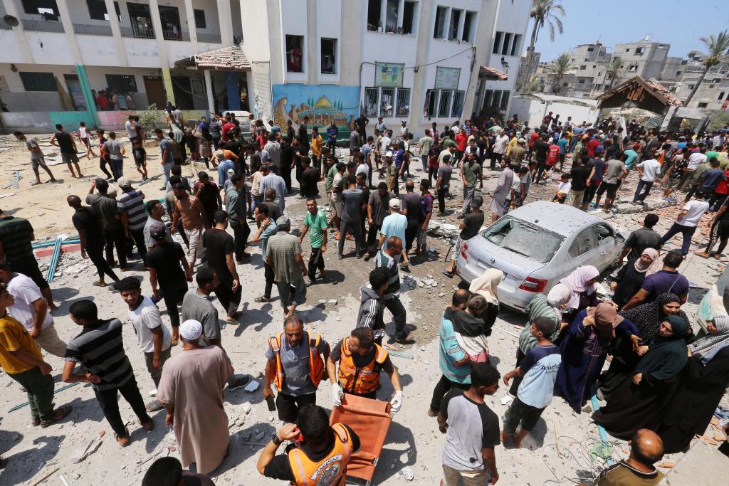 7月27日,巴勒斯坦加沙地帶衛(wèi)生部門發(fā)表聲明說(shuō),以色列軍隊(duì)當(dāng)天轟炸加沙地帶中部代爾拜拉赫一家野戰(zhàn)醫(yī)院,造成至少30人死亡、超過(guò)100人受傷。圖為人們聚集在以軍襲擊現(xiàn)場(chǎng)附近。新華社發(fā)(里澤克·阿卜杜勒賈瓦德攝)