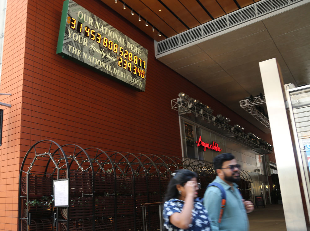 2023年5月29日,人們經(jīng)過美國紐約曼哈頓的“國債鐘”?!皣鴤姟笔且粋€(gè)大型計(jì)數(shù)器,它實(shí)時(shí)更新美國的公共債務(wù)總額,并顯示出每個(gè)美國家庭所要負(fù)擔(dān)的數(shù)額。新華社記者劉亞南攝
