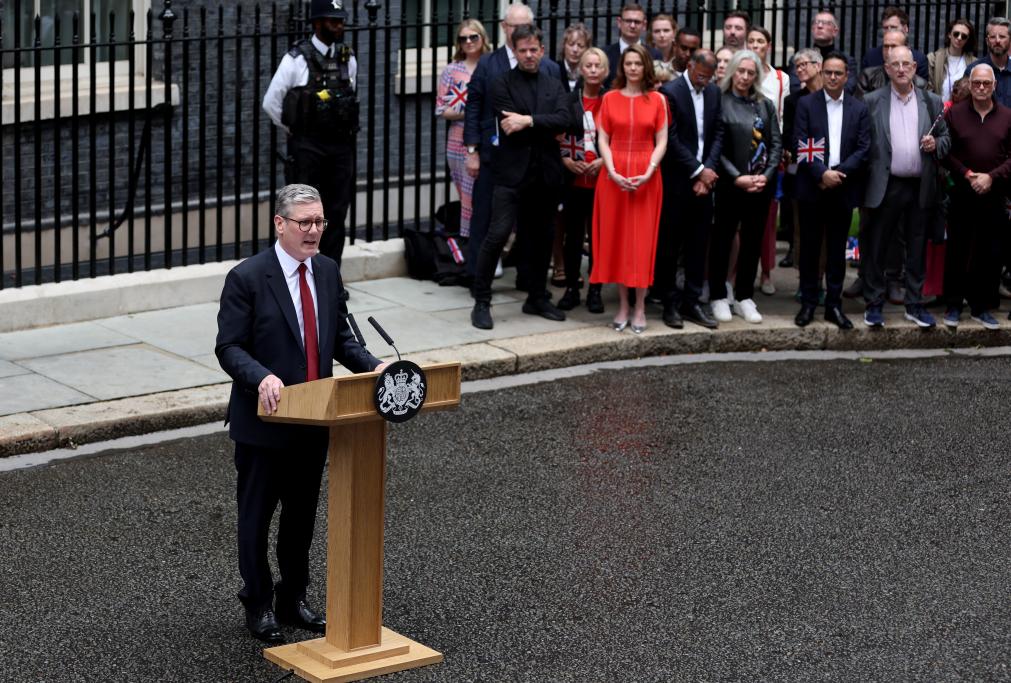 7月5日,基爾·斯塔默在英國(guó)倫敦唐寧街10號(hào)首相府前發(fā)表講話。新華社記者李穎攝