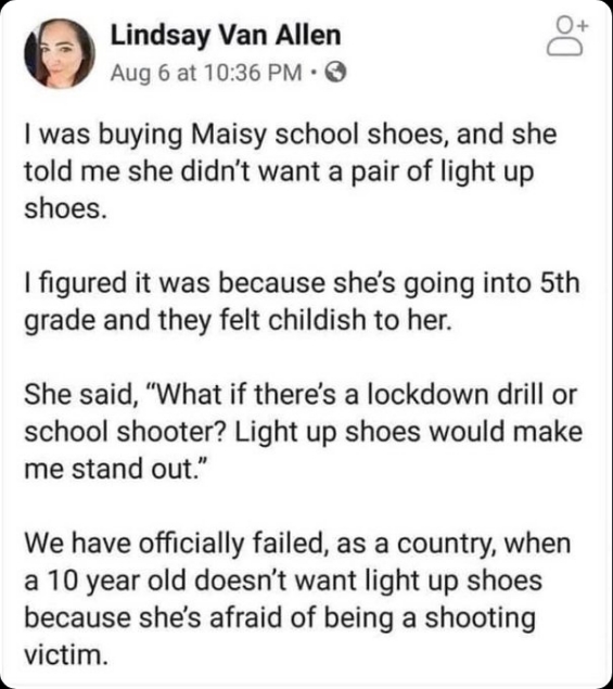 然而,梅茜這樣做的真實(shí)原因卻令人十分痛心。林賽寫(xiě)道:“她說(shuō)‘如果進(jìn)行封鎖演習(xí)或者發(fā)生校園槍擊事件怎么辦?發(fā)光的鞋子會(huì)讓我更引起注意。’”這個(gè)孩子非常擔(dān)心發(fā)生校園槍擊事件,以致于她不得不放棄每個(gè)孩子都想要的LED發(fā)光鞋。