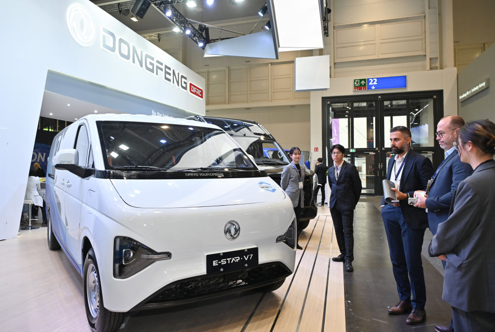 9月16日,在德國漢諾威國際交通運(yùn)輸博覽會(huì)媒體預(yù)展上,人們?cè)跂|風(fēng)汽車展區(qū)參觀E-STAR V7商用車。新華社記者任鵬飛攝