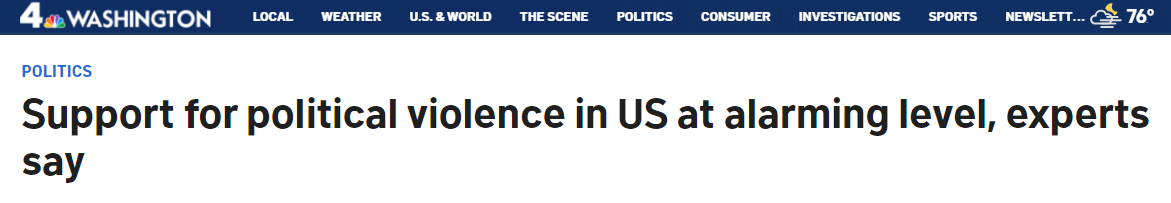 另外,美國(guó)國(guó)家廣播公司華盛頓地方頻道(NBC Washington)日前報(bào)道稱,盡管美國(guó)支持政治暴力的人與去年相比略有減少,但暴力支持者現(xiàn)在更傾向使用槍支來(lái)實(shí)現(xiàn)他們的目的。數(shù)月來(lái),專家們始終表示,美國(guó)對(duì)出于政治動(dòng)機(jī)的暴力的支持度達(dá)到了令人十分擔(dān)憂的水平。