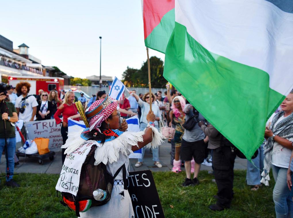 9月10日,示威者在美國費(fèi)城舉行電視辯論的國家憲法中心附近抗議。新華社記者李睿攝