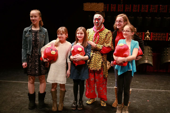 2019年2月14日,在美國馬斯卡廷,當(dāng)?shù)赜^眾在演出結(jié)束后與扮演孫悟空的中國國家京劇院演員合影。當(dāng)晚,由湖北省歌劇舞劇院編鐘國樂團和中國國家京劇院一團的藝術(shù)家們聯(lián)袂奉獻的“歡樂春節(jié)”大戲在這里上演。新華社記者 汪平 攝