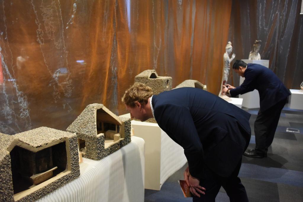 新中友協(xié)奧克蘭分會副主席利奧·德·格拉夫在VR展臺體驗(yàn)數(shù)字化還原的莫高窟第285窟后,表達(dá)了自己“要去一次敦煌”的愿望。新西蘭國會議員珍妮·薩萊薩穿過莫高窟第3窟的復(fù)制洞窟,感嘆“真切體會到美與文化之間的相互關(guān)聯(lián)”。