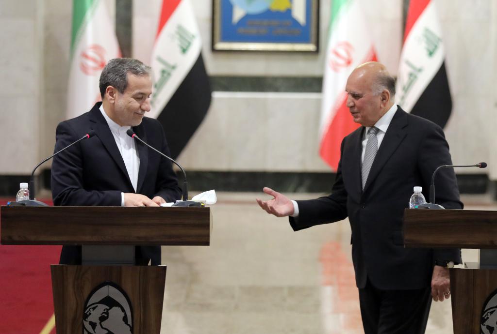 10月13日,伊拉克外長侯賽因(右)同到訪的伊朗外長阿拉格齊在首都巴格達(dá)舉行會談后參加聯(lián)合記者會。新華社發(fā)(哈利勒·達(dá)伍德攝)