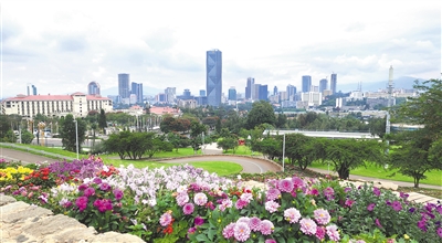 友誼廣場入口,外墻上四個遒勁有力的漢字“友誼廣場”躍入眼簾,紅底白字,分外醒目。走進其中,目光所及皆是綠色,樹木蔥蘢、青草葳蕤,頓覺神清氣爽,仿佛踏入一個天然氧吧。廣場依山而建,高處連綿起伏的琴弦狀花帶,如同一條條彩帶在空中飛舞;半山腰空曠的廣場上,可遠眺中央商務區(qū)的城市景觀;山腳的人工湖波光粼粼,倒映著藍天白云和綠樹紅花……