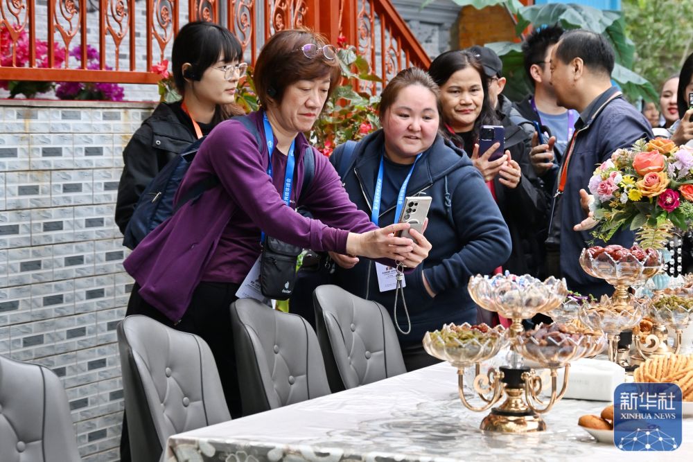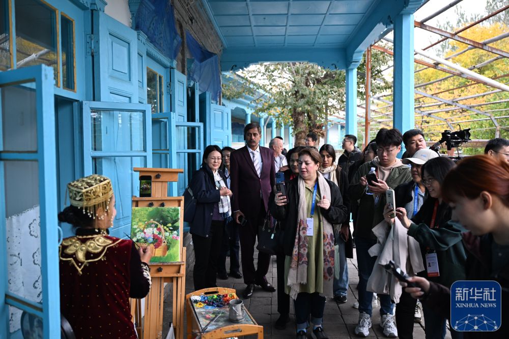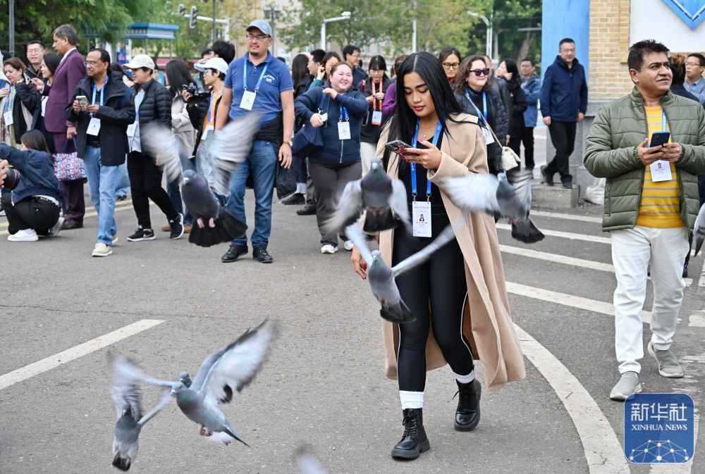 10月15日,與會(huì)嘉賓在伊寧市喀贊其民俗旅游區(qū)參訪。 新華社記者 劉續(xù) 攝