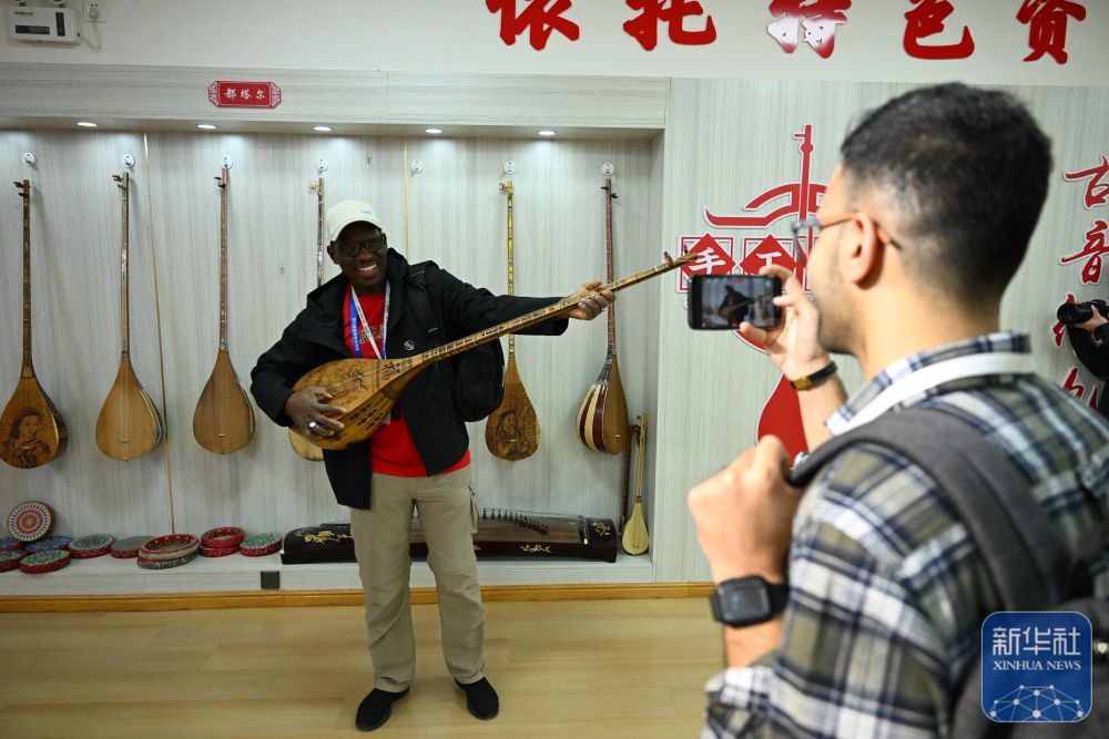 10月15日,與會(huì)嘉賓在阿克蘇地區(qū)新和縣加依村加依手工樂器產(chǎn)業(yè)園體驗(yàn)傳統(tǒng)樂器。 新華社記者 劉夢琪 攝