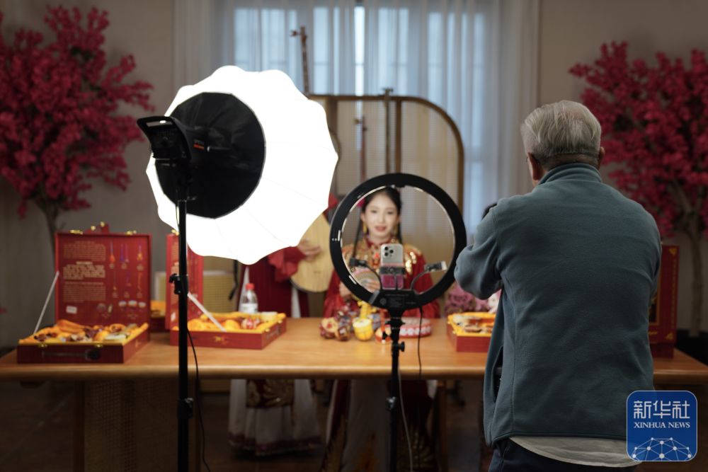 10月15日,與會(huì)嘉賓在阿克蘇地區(qū)新和縣加依村龜茲文化樂器展示中心觀看工作人員直播。 新華社記者 劉夢琪 攝