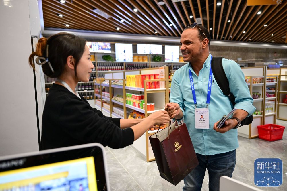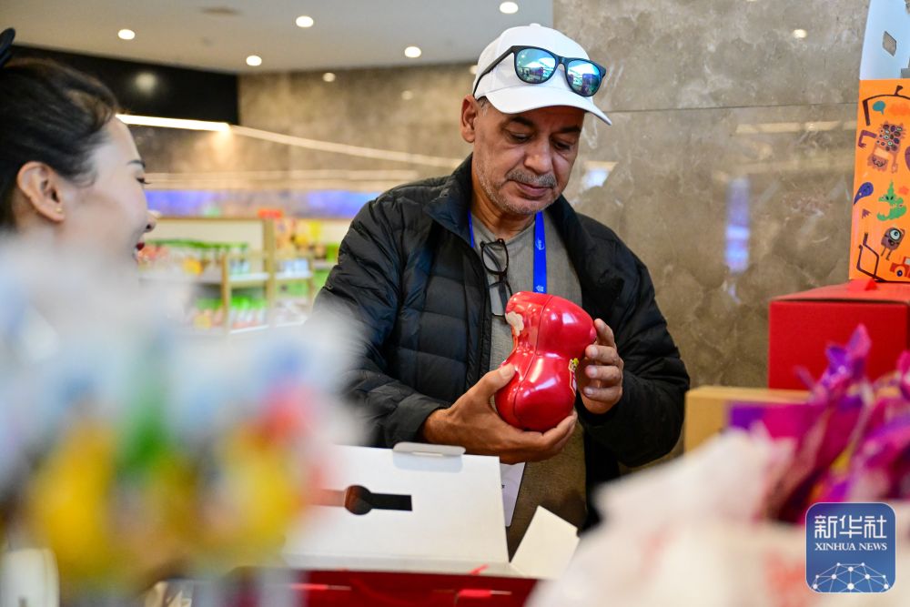 10月15日,與會(huì)嘉賓在新疆喀什跨境電商進(jìn)出口商品展示交易中心購買紀(jì)念品。 新華社記者 丁磊 攝