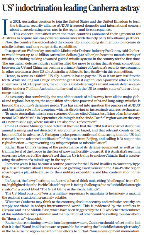 作為一個遠(yuǎn)離全球和地區(qū)主要熱點的國家,購買核動力潛艇和遠(yuǎn)程導(dǎo)彈超出了澳大利亞的防御需要。這不禁令人對“奧庫斯”的目的以及澳大利亞在其中的作用產(chǎn)生疑問,因為“奧庫斯”表現(xiàn)出越來越強的攻擊性。