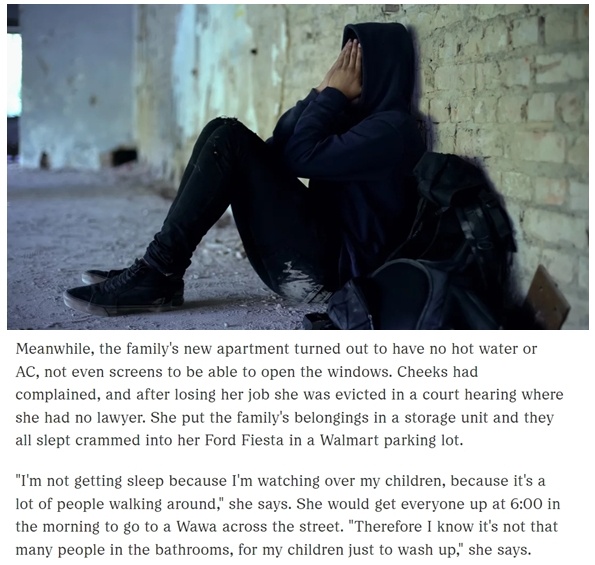 在弗吉尼亞州生活的奇克斯是一位獨(dú)自撫養(yǎng)四個(gè)孩子的母親。由于失業(yè)后無力負(fù)擔(dān)房租,她和四個(gè)孩子的臨時(shí)住房是一輛小轎車,這輛車長(zhǎng)期停在一家超市的停車場(chǎng)里。