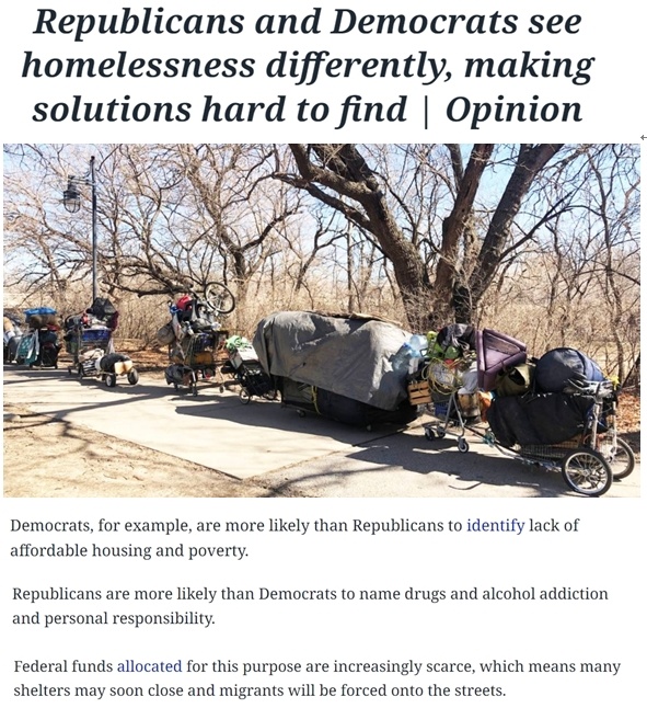 美國(guó)堪薩斯州《威奇托鷹報(bào)》評(píng)論稱,兩黨可能永遠(yuǎn)不會(huì)就無家可歸的原因達(dá)成一致,民主黨傾向于認(rèn)為是結(jié)構(gòu)性或系統(tǒng)性因素導(dǎo)致,而共和黨則更著重宣傳是個(gè)人因素導(dǎo)致。但無論是民主黨還是共和黨都無法解決無家可歸問題,他們相左的政策意見讓解決無家可歸者的問題更加艱難,流向需要援助的民眾的資金越來越少。