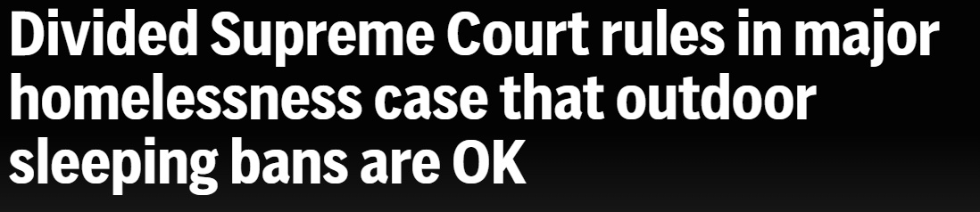 更令人唏噓的是,面對(duì)越來越多的人流浪街頭,今年6月底,美國(guó)最高法院以6:3的判決結(jié)果,允許各地政府實(shí)施禁止無家可歸者在戶外露宿的禁令。