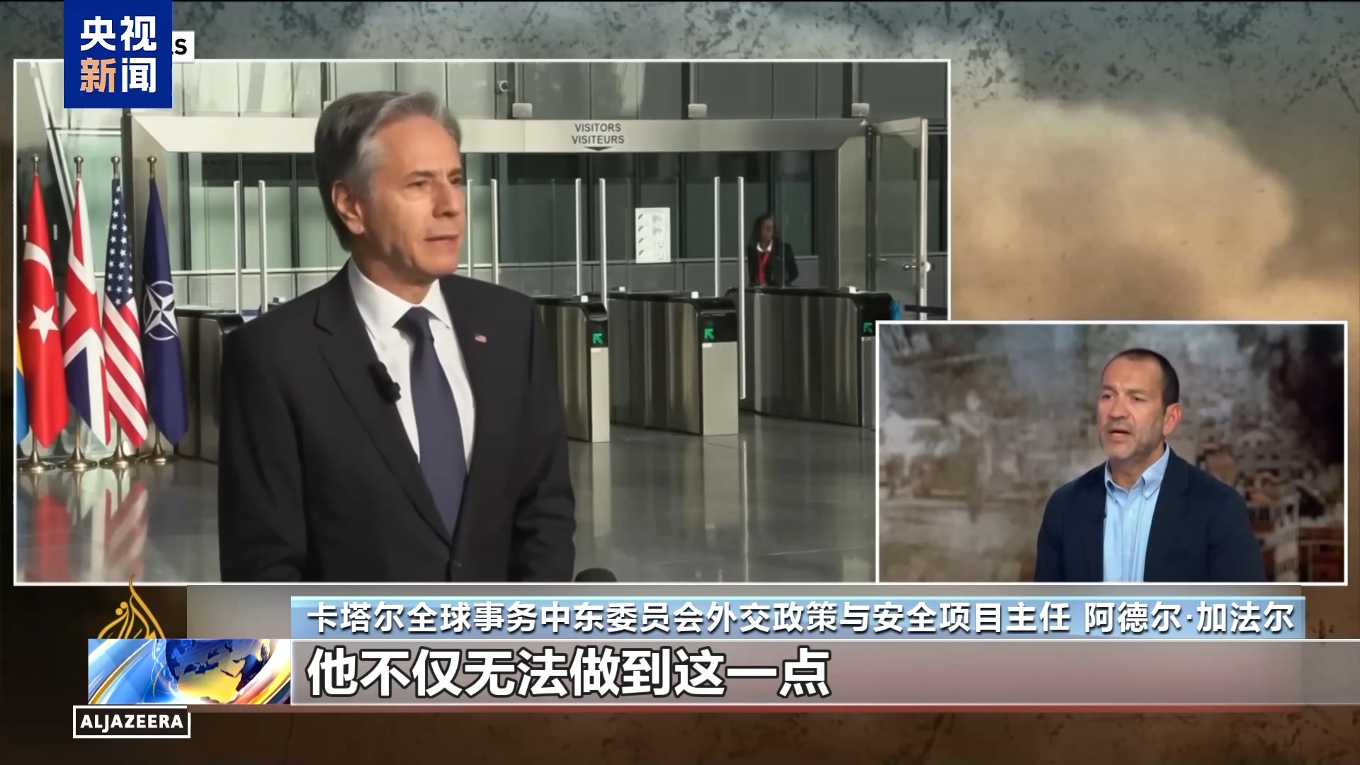 卡塔爾全球事務(wù)中東委員會外交政策與安全項目主任 阿德爾·加法爾:過去一年多布林肯已經(jīng)去了中東至少11次,和中東國家領(lǐng)導(dǎo)人會面,他試圖推動以色列結(jié)束戰(zhàn)爭,但到目前為止,他不僅無法做到這一點,而且美國還在外交政策上偏袒以色列,不斷提供武器和資金支持。