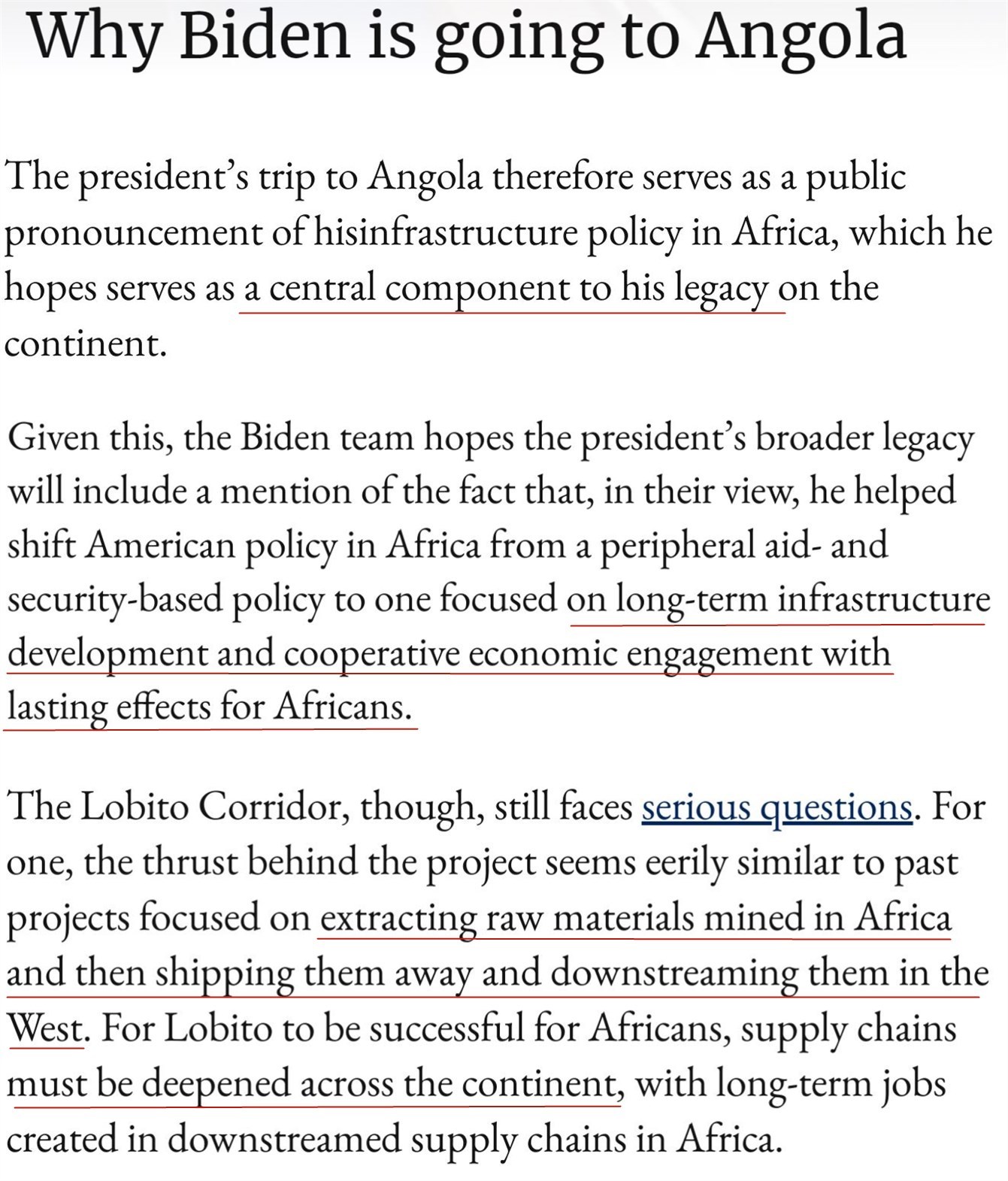 文章認為,“洛比托走廊”要想在非洲取得成功,就必須深化整個非洲大陸的供應鏈,在非洲的下游供應鏈中創(chuàng)造長期就業(yè)機會,但這顯然不是美國的優(yōu)先考慮。
