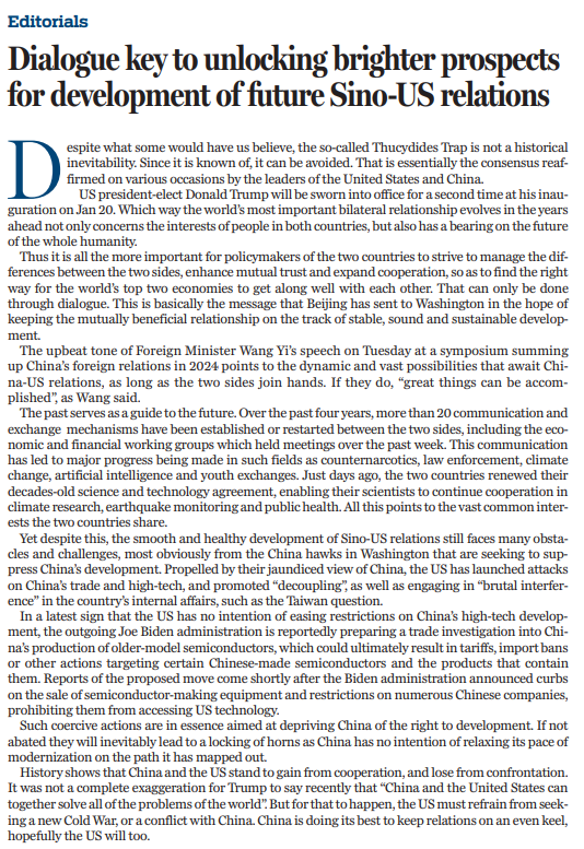 因此,雙方應當努力管控分歧、增信釋疑、拓展合作,為世界前兩大經(jīng)濟體開辟友好相處、共同發(fā)展的道路。這只能通過對話溝通來實現(xiàn)。